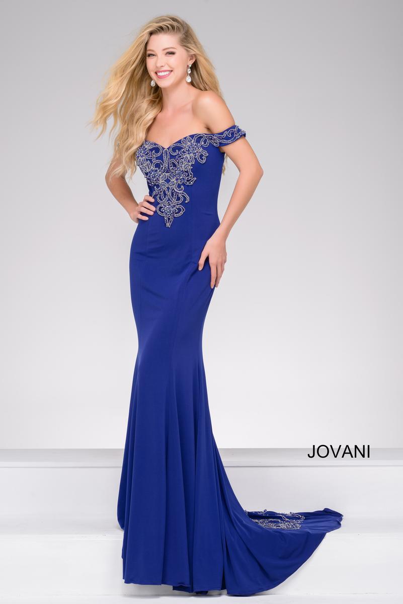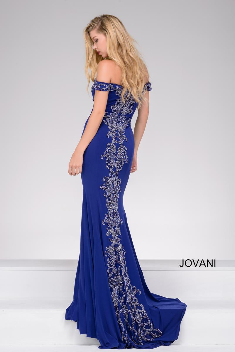 Stunning strapless with sweetheart neckline Jovani gown. Material: Jersey with a beaded bodice and trailing beaded detail on the back and train. Perfect for any occasion.