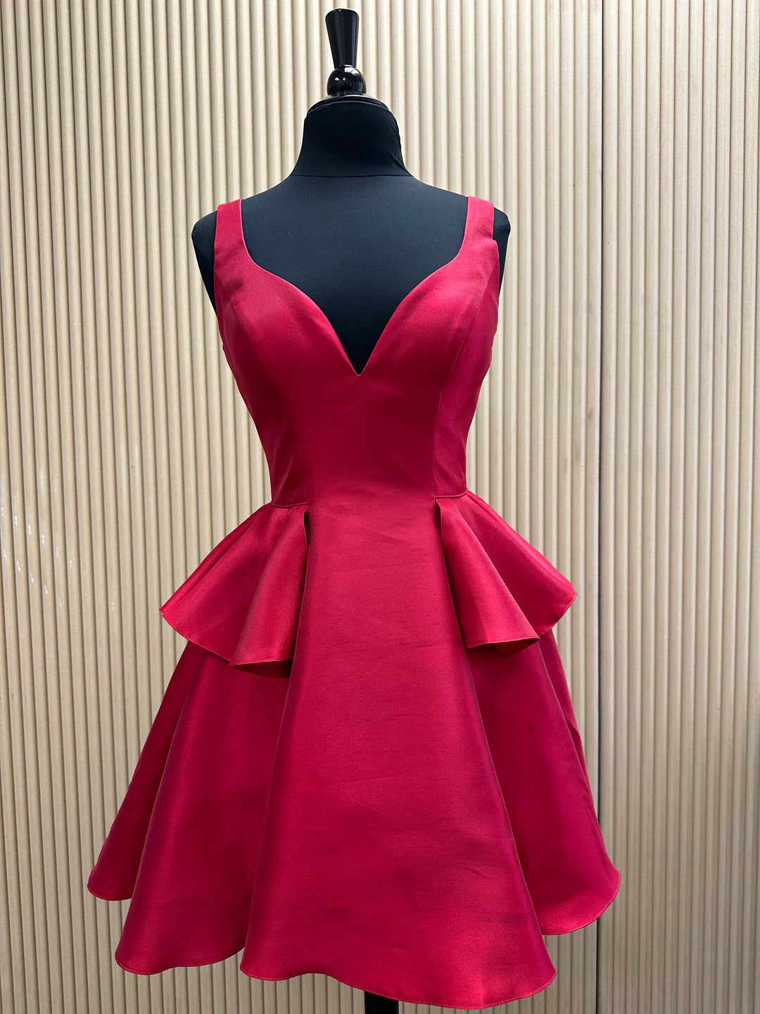 Sherri Hill S50888 is a satin v-neck dress with wide shoulder straps that fall to a matching v-back. The skirt has a flirty ruffle on an A-line skirt.